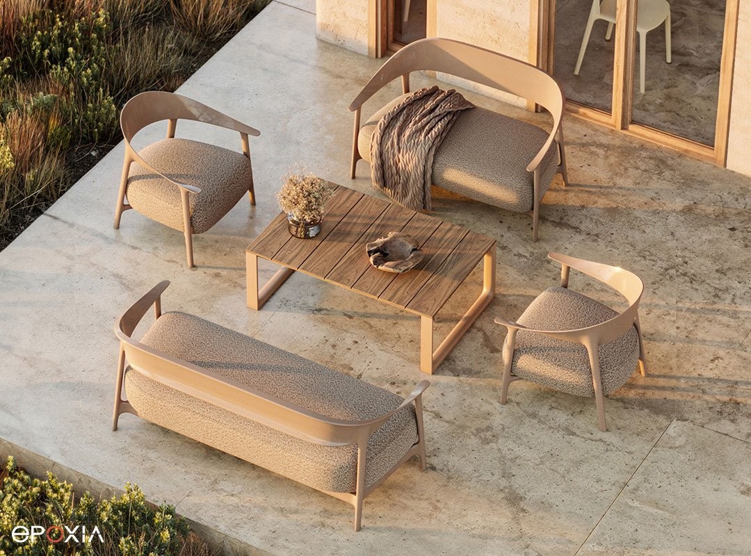 Canapé Africa 2 places, structure en polypropylène et assise tissus pour l’extérieur.