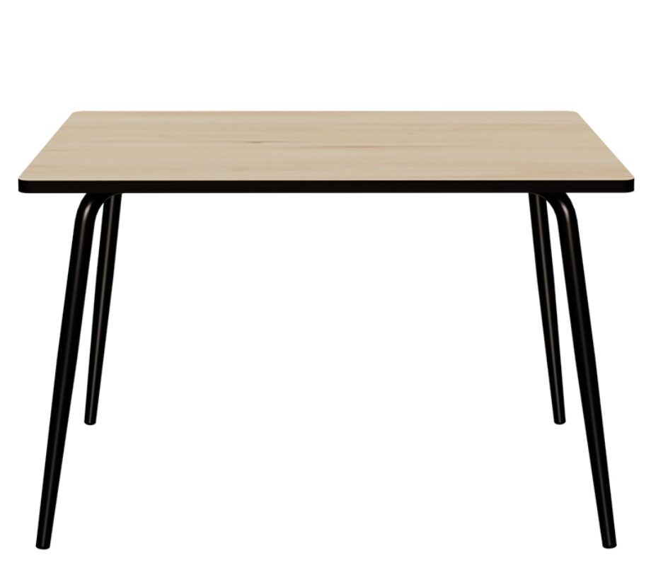 Table Vera, plateau en placage chêne naturel, pieds en acier noir. Style années 50.